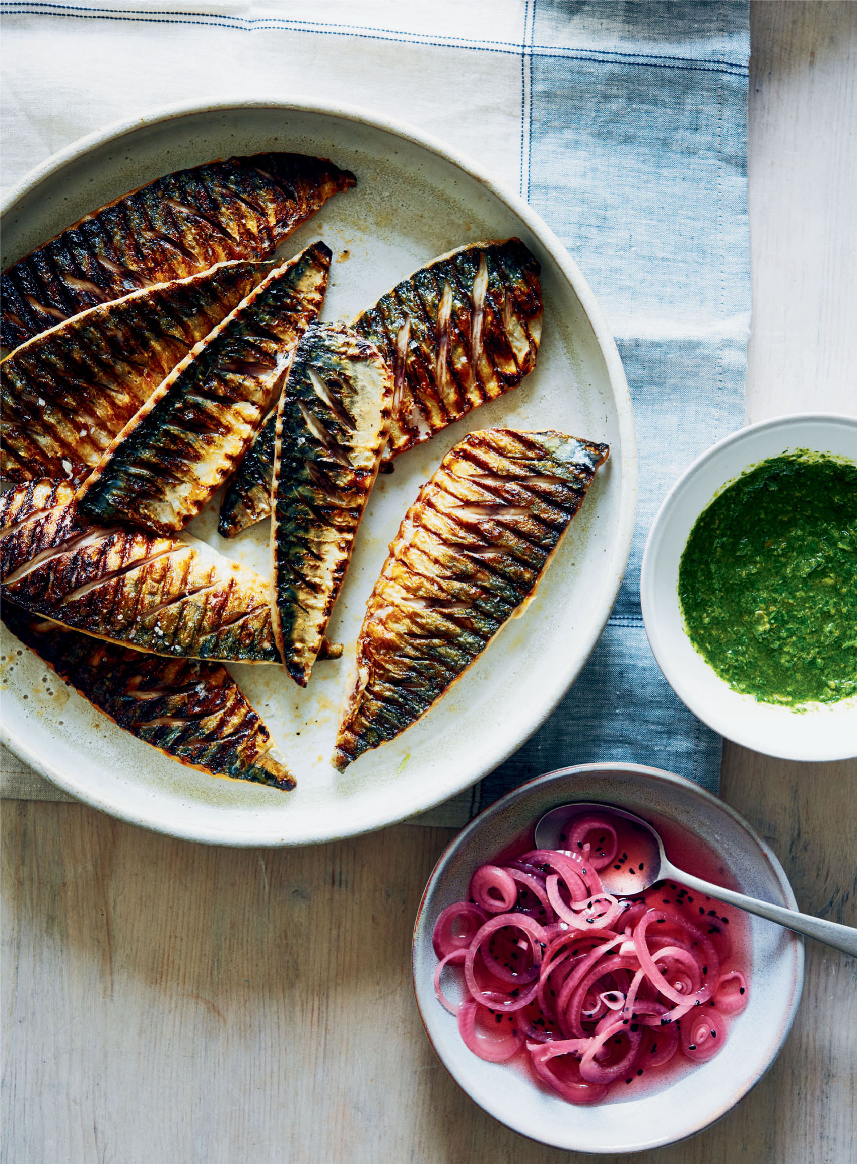 Chargrilled Mackerel, Pickled Onions and Salsa Verde