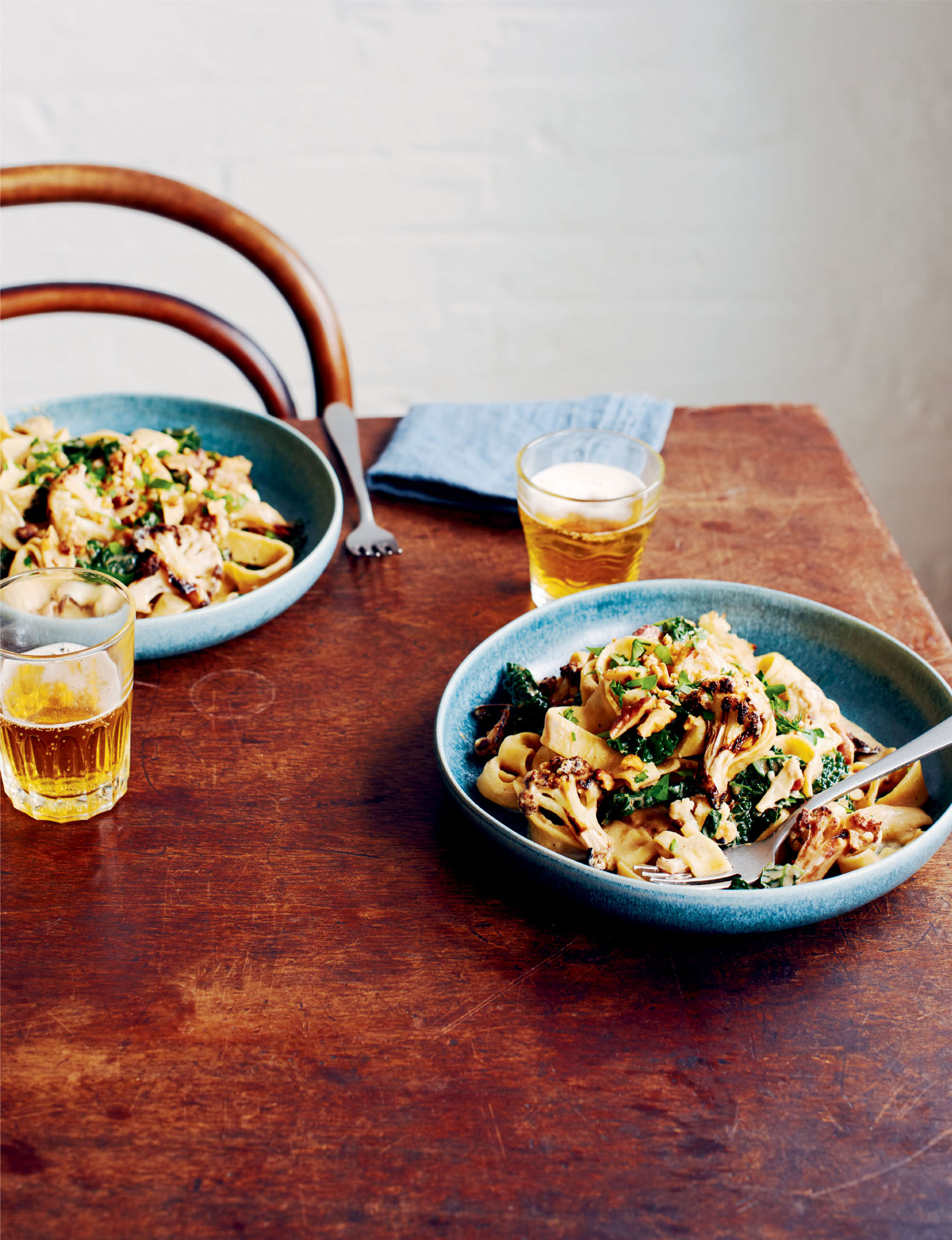 6 Mix the tagliatelle and cavolo nero with the roasted cauliflower and walnut sauce. Add a little pasta water to your sauce to loosen it a little if desired. Stir through the remaining roasted cauliflower and toasted nuts and parsley and serve.