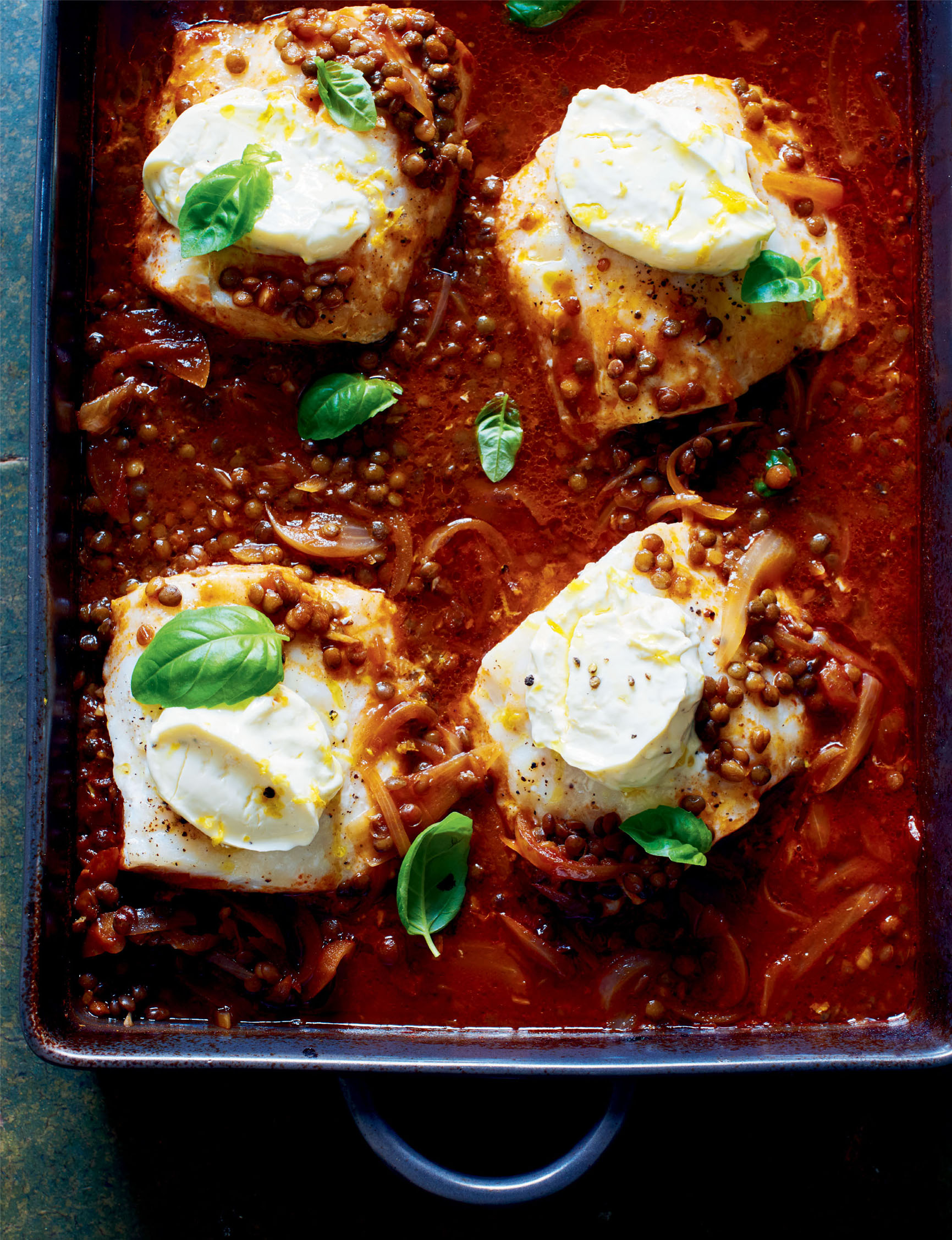 Baked Haddock with Lentils, Basil and Mascarpone