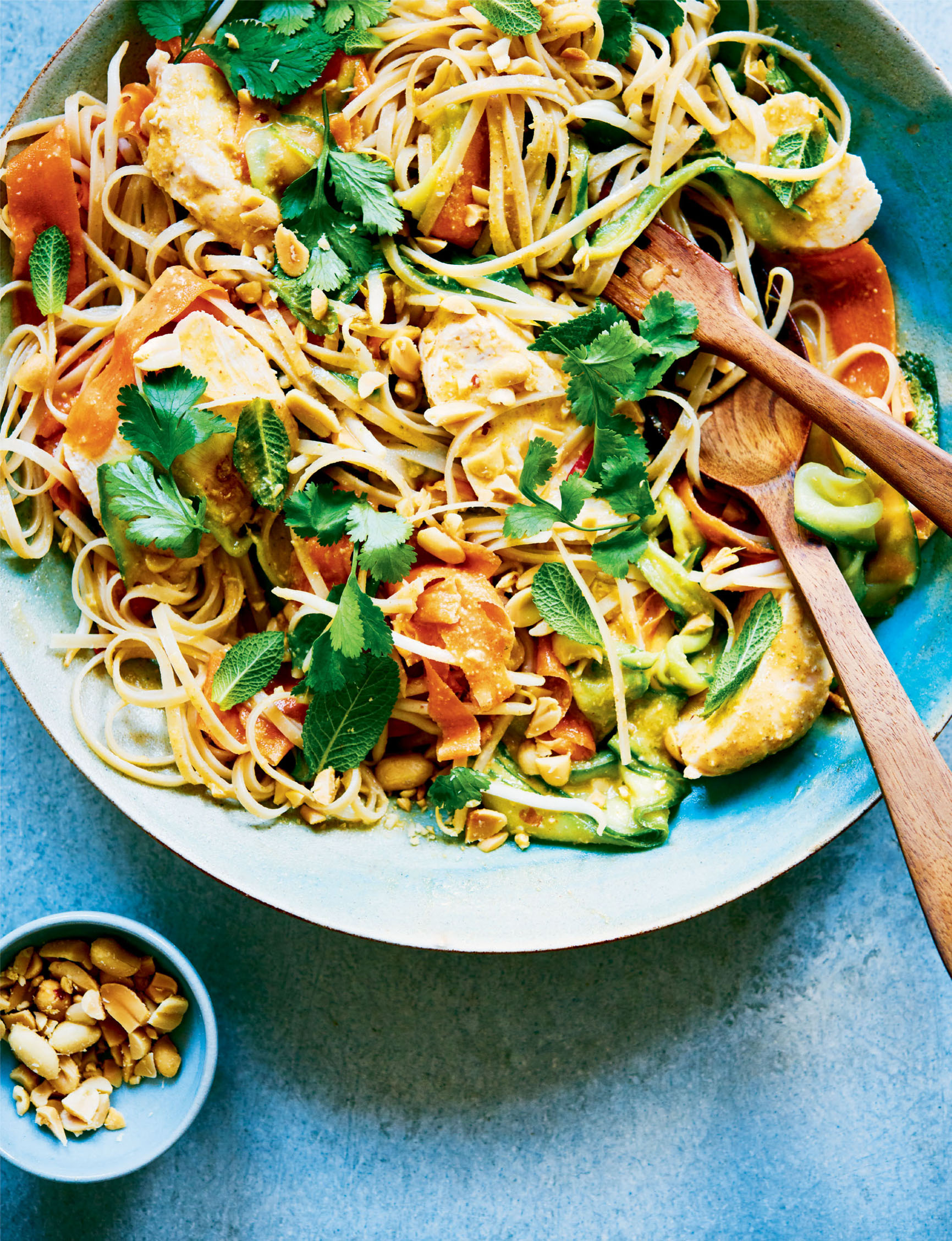 I am sure everyone has their own version of their favourite Thai chicken salad. This is mine. I really enjoy the freshness of the lime and coriander, and the savoury richness that the toasted peanuts add. My kids love the noodles, but not too much heat, so I tend to scatter extra chilli on top of mine after serving. To maximise the flavour, I suggest marinating the chicken breasts the night before, though you can skip this step (or marinate for a shorter time) if you’re in a hurry.