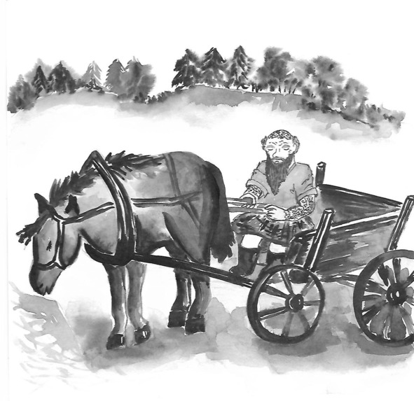 Из леса на поляну выехала повозка, на облучке которой сидел пожилой лысый мужчина с ярко-рыжей бородой. Он дремал, склонив голову. Весь череп и открытые части рук были покрыты замысловатыми татуировками.