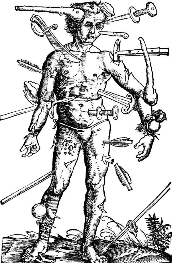 Ранения разными видами оружия. Гравюра из «Полевой книги хирурга», в которой описано лечение ран. 1517 г.