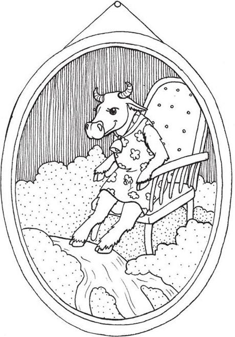 Viņas garastāvoklis kā balts tvaiku mutulis, kāds paceļas no govs nāsīm dzestrā rītā, uzšāvās līdz pat padebešiem un iztraucēja Bunga launaga snaudu, arfas melodiju ieaijātu. Sargeņģelis nemēdza ātri apvainoties. Nekad un nemūžam! Kur nu vēl uz tādu govslopu, kam, pēc viņa domām, smadzeņu vietā pieneņu pūkas un pārliecības vietā nekļūdīgi instinkti, kā atrast leknāku zāli palieņu pļavās. Tomēr, teicami pārvaldīdams telepātiju jeb domu iedvešanu no attāluma un gribēdams izjokot miera traucētāju, viņš tai iesūtīja ideju, ka vēl labāk būtu dzīvot šajā pasaulē, ja tajā tecētu piena upes ķīseļa krastos. Svētaļa saminstinājās un mazliet neuzticīgi, bet uzmanīgi palūkojās uz tesmeni, klausīdamās, kā pieriet piens… Tīkamā doma pamazām pārņēma viņu savā varā. Govs izslējās klubkrēslā un apvēlās augšpēdus. Savēzēja vienu kāju kā burvju māksliniece un – tavu brīnumu – komfortablo kūti pēkšņi šķērsoja četras apmēram metru platas upes, kam krastos burzguļoja ķīseļa plēvīte, šur tur izraibināta ar kakao pupiņām kā sīkiem oļiem. Brūnaļa bija bezgala ziņkārīga, tāpēc iemērca purnu visās upēs pēc kārtas un atklāja, ka pirmajā ir vaniļas piens, otrajā – zemeņu piens, trešajā – šokolādes piens, bet ceturtajā – Pē! – vājpiens. Toties ķīseļu izpēte prasīja ilgāku laiku, līdz viņas garšas kārpiņas noteica rabarberu, ābolu un melleņu garšas. Svētaļa ar kājas nagu aizklāja labo aci, pēc tam kreiso, taču nekas nemainījās. Upes čaloja un plūda. Uz kurieni? Uz viņām vien zināmo piena jūru? Uz pienotavu vai varbūt iebiezinātā piena fabriku?