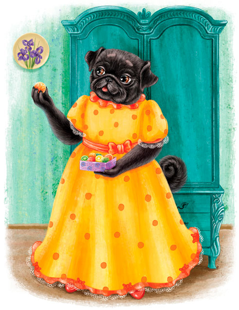 Зефирка взяла самую темную конфетку, быстро положила в рот, потом схватила оранжевую и светло-желтую. Она сегодня очень расстроена, ей не дали любимую белую подливочку, сообщили ужасную весть про диету, утешиться надо по полной программе! Лучшая портниха всхлипнула. Так плохо с ней сегодня поступили, так отвратительно, что и мармеладка не спасает от горькой обиды. И вдруг в момент отчаянного горя нос мопсихи учуял восхитительный аромат свежей сдобы! Зефирушка втянула ноздрями запах, поняла, что он идет слева, повернулась и увидела на подоконнике тарелку, а на ней целых три маффина!