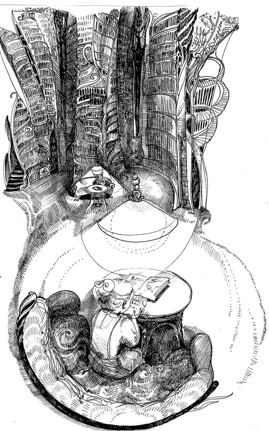 Они застала доктора в комнате, приходившейся Королеве, очевидно, спальней. Посредине комнаты, чуть выше уровня пола, висело большое ложе в виде просторной лодки. Доктор стоял рядом и испуганно озирался.