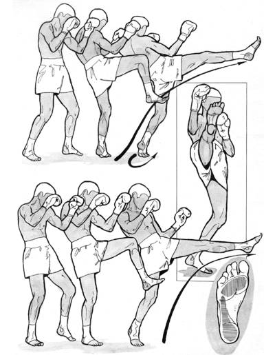 смещается на левую ногу с одновременным движением вперед-вверх правой ноги, согнутой в коленном суставе, и выведением вперед правого плеча. Как только правое бедро оказывается направленным вперед, правая нога разгибается в коленном суставе, посылая стопу вверх-вперед к цели. Увеличению силы удара способствует движение тазом вперед.