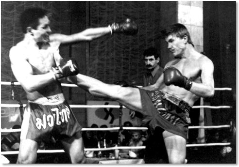 Прямой удар ногой. Рис. из книги С. Заяшникова «Тайский бокс» (1-е изд., 1994 г.)
