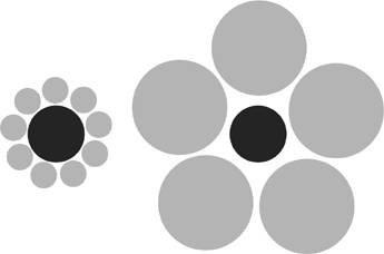 As you can see, the middle circle can't seem to stay the same size. When placed among the larger circles, it gets smaller. When placed among the smaller circles, it grows bigger. The middle circle is the same size in both positions, of course, but it appears to change depending on what we place next to it.