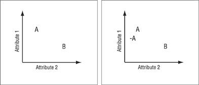 In the left side of this illustration we see two options, each of which is better on a different attribute. Option (A) is better on attribute 1—let's say quality. Option (B) is better on attribute 2—let's say beauty. Obviously these are two very different options and the choice between them is not simple. Now consider what happens if we add another option, called (−A) (see the right side of the illustration). This option is clearly worse than option (A), but it is also very similar to it, making the comparison between them easy, and suggesting that (A) is not only better than (−A) but also better than (B).