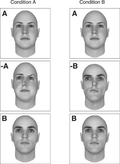 No flashes of lightning illuminated my laboratory; nor was there a baying of the hounds on the moor. But this was still a good day for science. By the time I was through, I had the MIT equivalent of George Clooney in his prime (A) and the MIT equivalent of Brad Pitt in his prime (B), and also a George Clooney with a slightly drooping eye and thicker nose (−A, the decoy) and a less symmetrical version of Brad Pitt (−B, another decoy). I followed the same procedure for the less attractive pairs. I had the MIT equivalent of Woody Allen with his usual lopsided grin (A) and Woody Allen with an unnervingly misplaced eye (−A), as well as Danny DeVito (B) and a slightly disfigured version of Danny DeVito (−B).