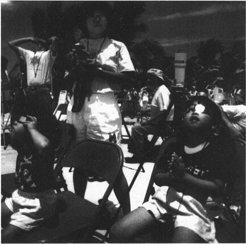 Two small Japanese girls watch the progress of the eclipse through special Mylar sunglasses, while their mother watches anxiously. The Moon’s shadow is now sweeping across the globe towards us on the beach at Los Cabos at twice the speed of Concorde. In an orbit above the earth, a weather satellite photographs the shadow of the Moon every half-hour during its journey.