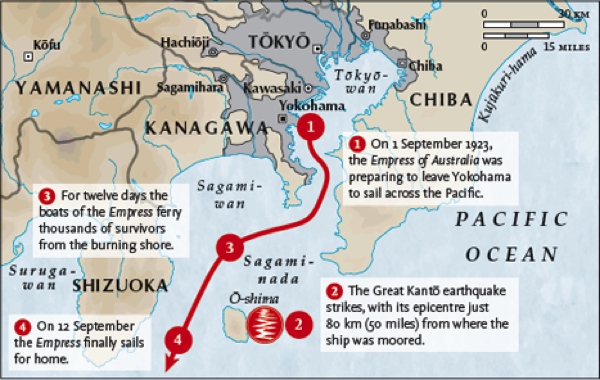 The Empress had been hit by the Great Kantō earthquake. This measured 8.3 on the Richter scale and had its epicentre beneath Ō-shima Island in Sagami Bay, just 80 km (50 miles) from where the ship was moored.