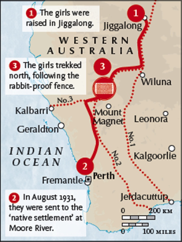 Molly Craig, 14, her half-sister Daisy Kadibil, 11 and their cousin Gracie Fields, 8, arrived at the Moore River Settlement north of Perth in August 1931. They had been taken from their family in Jiggalong nearly 1,600 km (1,000 miles) away and they immediately decided to return home no matter what the consequences. Their plan was simple: they would follow the rabbit-proof fence.