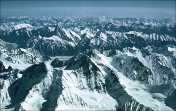 The snow-covered peaks of the Karakoram Range, Pakistan.
