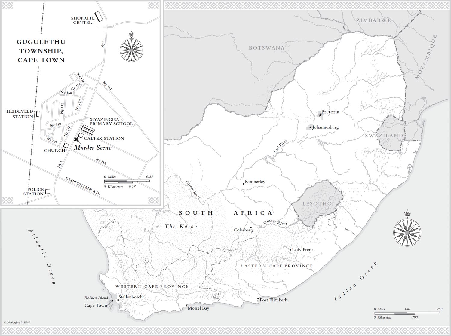 The journalists and documentarians and small-time film producers filed out of the van and toward St. Columba Anglican Church, a gray-brick building on the corner of NY1 and NY109 in Gugulethu, a township eleven miles outside Cape Town city center. Easy and I stayed behind, he in the driver’s seat and me on the passenger’s side. Easy was a short, compact man with butterscotch skin and a large, round, clean-shaven head. At forty-two, he had this weird ability to shape-shift. Did he look like a hardened old gangster? Yes, some days. Did he look like an adorable, harmless child? Yes, some days. In one of the photos I’ve snapped of him over the years, he is menacing, crouching on the ground with a cigarette between his thumb and forefinger, his band of brothers behind him, one of them holding up a disembodied sheep’s head. But in the next, he’s curled on a small stool, cradling his infant son and smiling as his ten-year-old daughter drapes herself over his shoulder.
