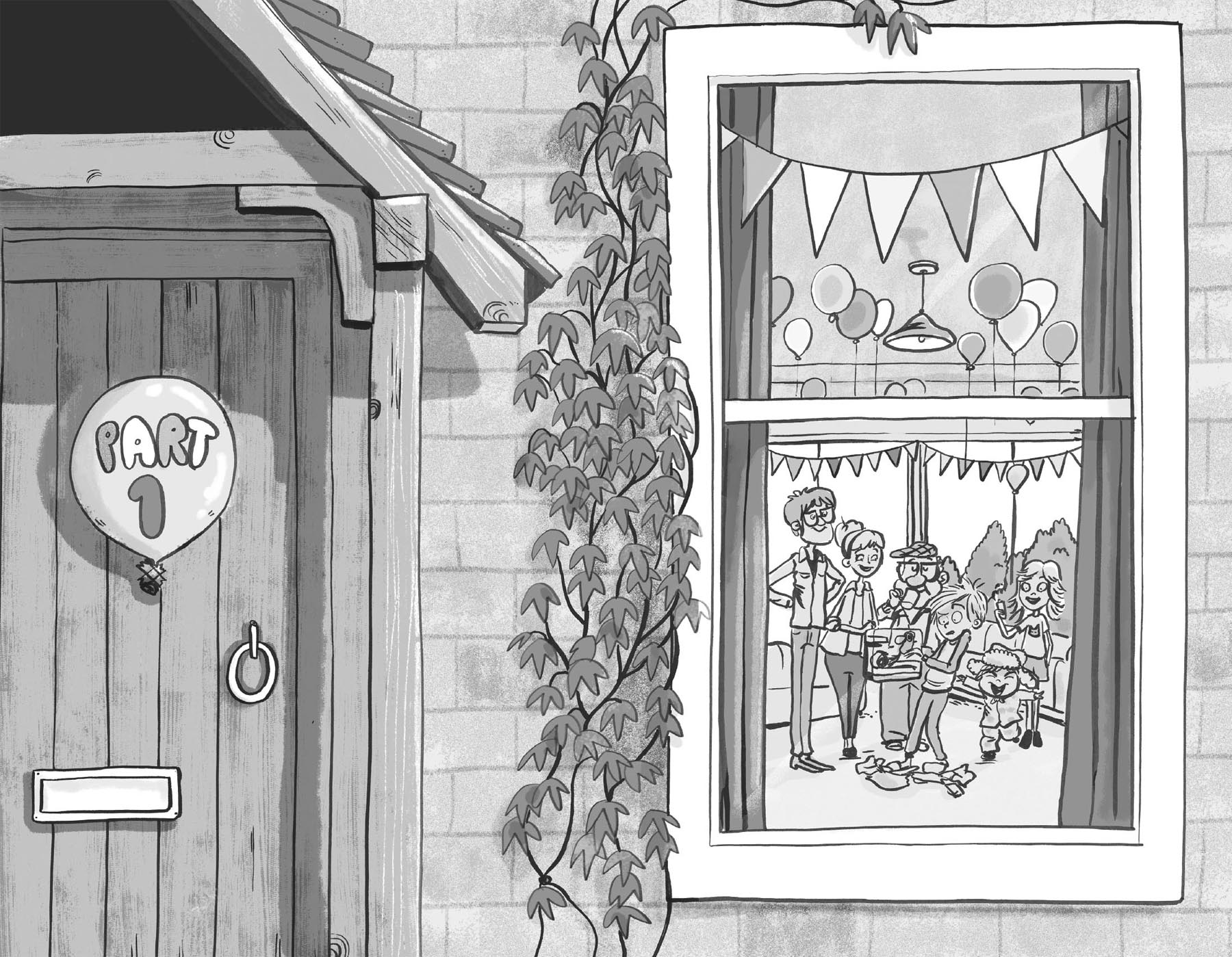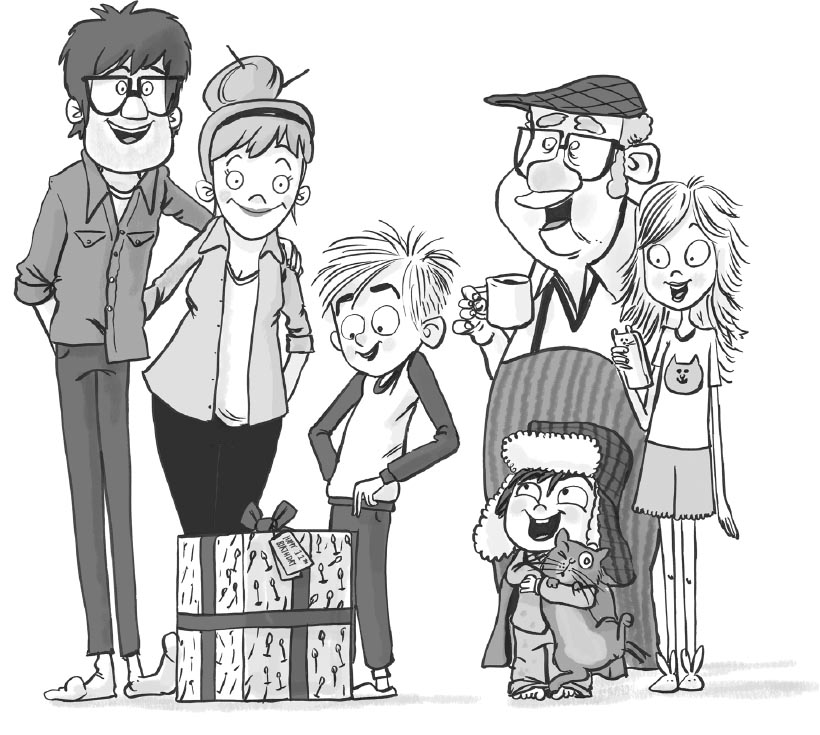 But the Baileys – that was his full name, Malcolm Bailey – had a family tradition, which was that they also sang ‘Happy Birthday’ when giving the children their birthday presents. So this song wasn’t being sung at a party, and it was not accompanied by a cake. It was just Malcolm’s mum and dad (Jackie and Stewart), his grandpa (Theo), his teenage sister (Libby) and his little brother (Bert), on the morning of his eleventh birthday, standing in a circle, in the living room, round a box, covered in wrapping paper (which actually did have printed candles on it).