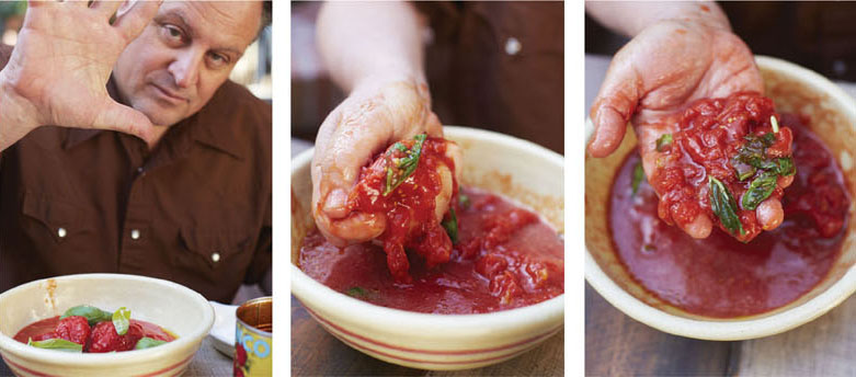 Empty the can of tomatoes, with their juice, into a large bowl. Add the olive oil with the basil and salt (if using) and using your hands, crush the tomatoes; discard any bits of skin or hard yellow “shoulders,” or cores. The better the tomato, the less likely you are to find shoulders and hard cores. You want to end up with a textured yet silky sauce. I like it when the sauce isn’t uniform, when there are still bits and pieces of tomato; I also don’t like using an immersion blender or food processor because these can bring out the bitterness of the seeds. A hand-crushed sauce has a better mouthfeel and won’t be so one-dimensional.