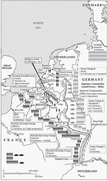 No more than his nation did the prime minister grasp the speed of approaching catastrophe. The Allied leaders supposed themselves at the beginning of a long campaign. The war was already eight months old, but thus far neither side had displayed impatience for a decisive confrontation. The German descent on Scandinavia was a sideshow. Hitler’s assault on France promised the French and British armies the opportunity, so they supposed, to confront his legions on level terms. The paper strengths of the two sides in the west were similar—about 140 divisions apiece, of which just nine were British. Allied commanders and governments believed that weeks, if not months, would elapse before the critical clash came. Churchill retired to bed on the night of 10 May knowing that the Allies’ strategic predicament was grave, but bursting with thoughts and plans, and believing that he had time to implement them.