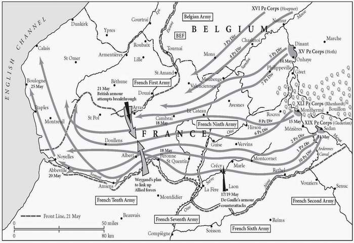On the 20th he told the chiefs of staff that the time had come to consider whether residual Norwegian operations around Narvik should be sustained, when troops and ships were urgently needed elsewhere. On the Continent, the Germans were driving south and west so fast that it seemed doubtful whether the BEF could regain touch with the main French armies. Gort was still striving to pull back forces from the Scheldt. That night, German units passed Amiens on the hot, dusty road to Abbeville, cutting off the BEF from its supply bases. Still Churchill declined to despair. He told the war cabinet late on the morning of the 21st that ‘the situation was more favourable than certain of the more obvious symptoms would indicate’. In the north, the British still had local superiority of numbers. Fears focused on the perceived pusillanimity of the French, both politicians and soldiers. That day, a British armoured thrust south from Arras failed to break through. The BEF was isolated, along with elements of the French First Army. Calais and Boulogne remained in British hands, but inaccessible by land.