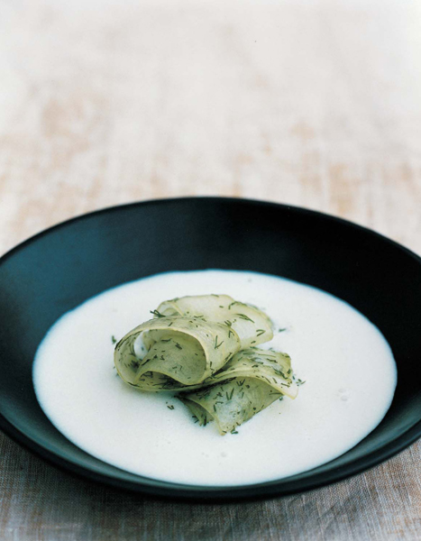 To serve, pour the cold soup into chilled bowls and garnish with the dressed cucumber ribbons and dill fronds.