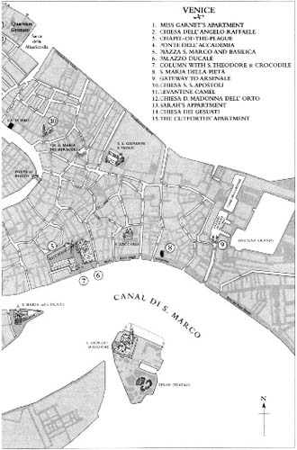 Miss Garnet found that the departure of the newly met Americans left her feeling forlorn. Impatient with what seemed a silly show of sentimentality in herself, she caught up her suitcase and her hand luggage and looked about to get her bearings. Above her the angel winked down again and she now took in that this was the frontage of the Chiesa dell’Angelo Raffaele itself, which lent its name not only to the campo but also, most graciously, to the waterfront before it.