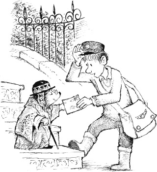 While she was talking she tied a large label round her nephew’s neck. “I’ve knotted the string twice over,” she said, “so it shouldn’t come apart. But you may find it very useful, so do take care of it.”