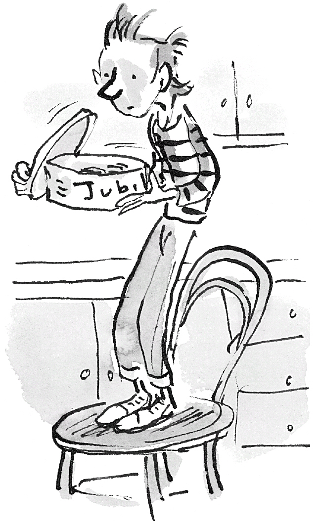 So he quickly slid his chair over to the cupboard and stood on it to reach the biscuits. He lifted the biscuit tin. It was a big Silver Jubilee assortment tin from 1977 that featured a scratched and faded portrait of a much younger Queen Elizabeth II on the lid. It felt really heavy. Much heavier than usual.