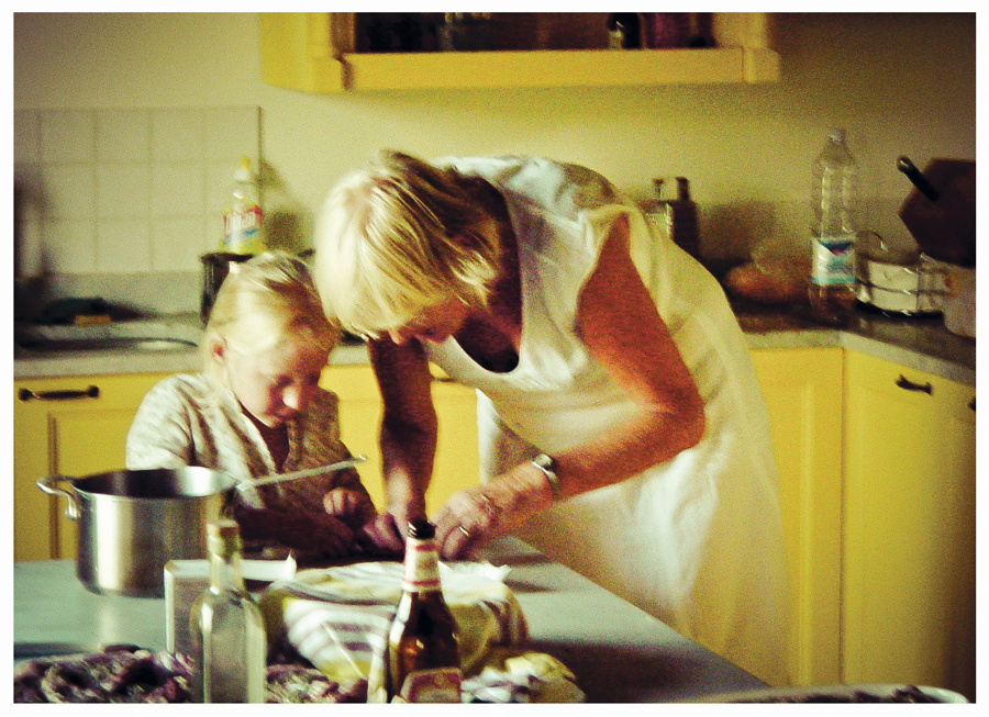 Rose teaching Alex how to peel tomatoes, Italy, 2004.
