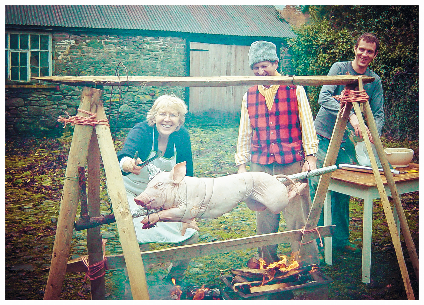 Rose cooking the pig for Christmas lunch 2007 with David, her husband, and my brother Dante in the courtyard of Cabalva farmhouse, Wales.
