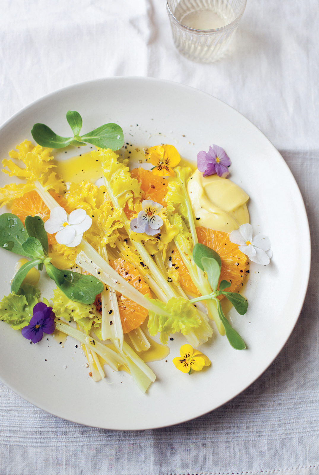 AN EARLY SPRING SALAD OF SEA KALE WITH VIOLA FLOWERS, ORANGE, PURSLANE AND MAYONNAISE