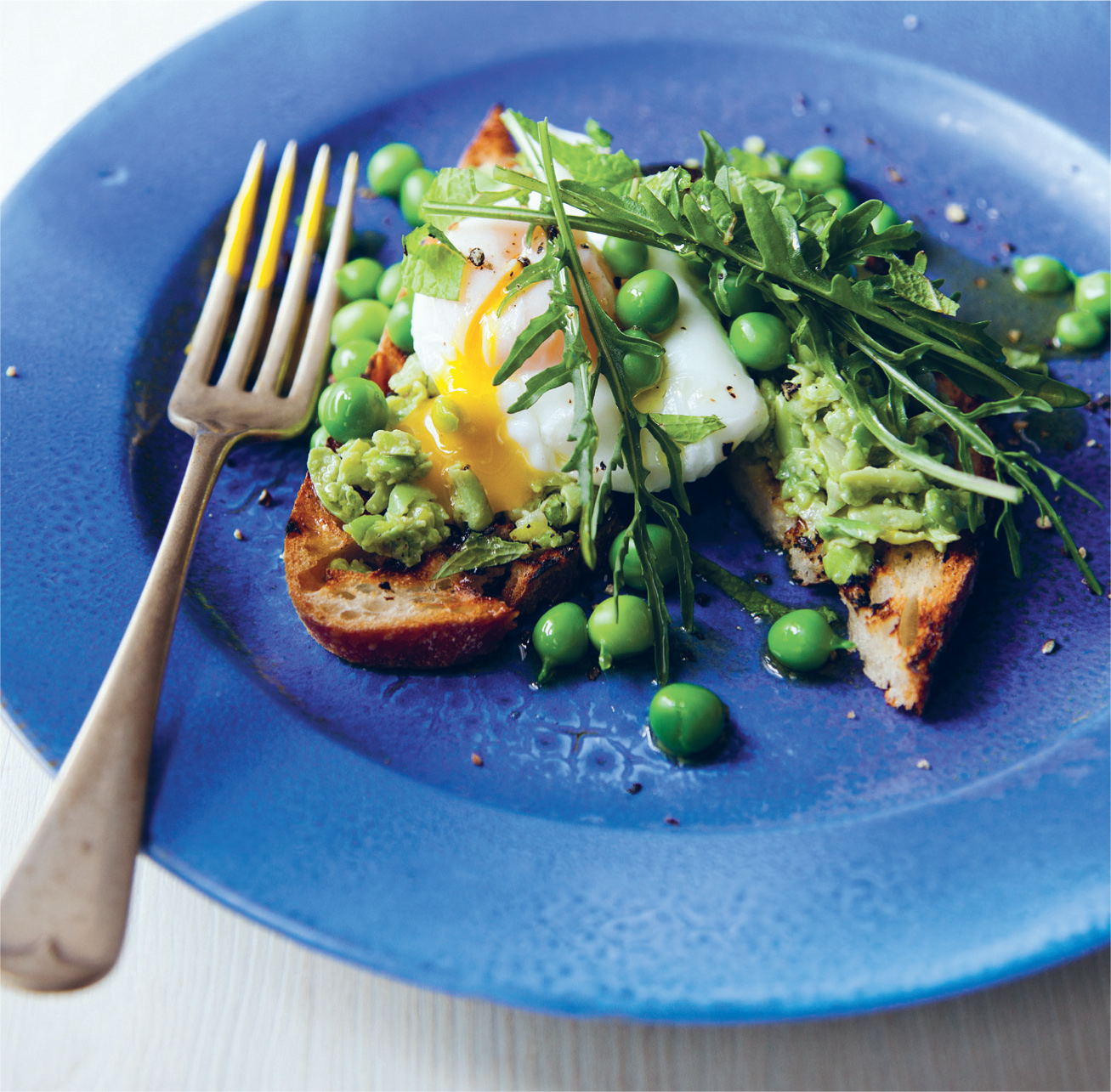 BROAD BEANS AND PEAS ON TOAST WITH PARMESAN, ROCKET AND A POACHED EGG