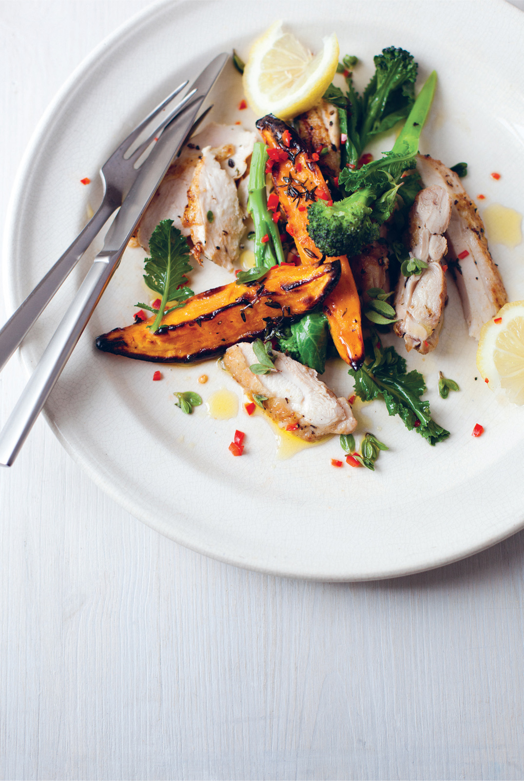 Slice the chicken at an angle into strips and serve with the sweet potato, broccoli and a spoonful of sour cream. We love chilli in our family, so I lightly scatter the chopped fresh chilli over the top with a few marjoram leaves and a squeeze of lemon. This makes all the difference.
