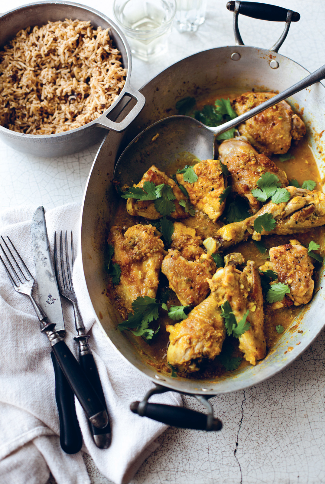 Put the garlic and spice mixture into the still-hot pan (you may need to add a little more oil) and stir to release their flavours. Add the ginger and chopped chilli and stir-fry for a minute or so. Add the chicken pieces and any juices that have been released, then add 8 tablespoons of water and the lemon juice. Stir, then turn up the heat and bring to a boil, cover with a tight-fitting lid and turn the heat right down to a gentle simmer. Cook for 15 minutes until the chicken is tender and cooked through. Remove the lid and scatter the chopped coriander over. Serve with spiced basmati rice (see here).