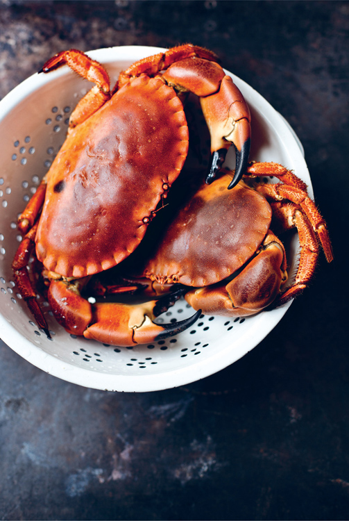 To prepare the crab once cool, place it on its back on a chopping board, then pull the legs and claws away from the main body and put to one side. To separate the main outer shell from the crab’s undercarriage, keep the crab on its back and remove the tail flap, then ease the top and bottom apart with your fingers (you might need to separate the meat from the shell first by inserting a blade between the two and twisting it to release). Discard the stomach sac, just behind the mouth, then remove the dead man’s fingers, which have a greyish gill-like texture to them. Scoop out the brown meat from the upper shell with the juices. Using a strong, sharp knife, cut the body section in half and with a skewer or crab pick, carefully remove the delicate white meat. Crack the claws with a hammer once in each of their different joints or sections.