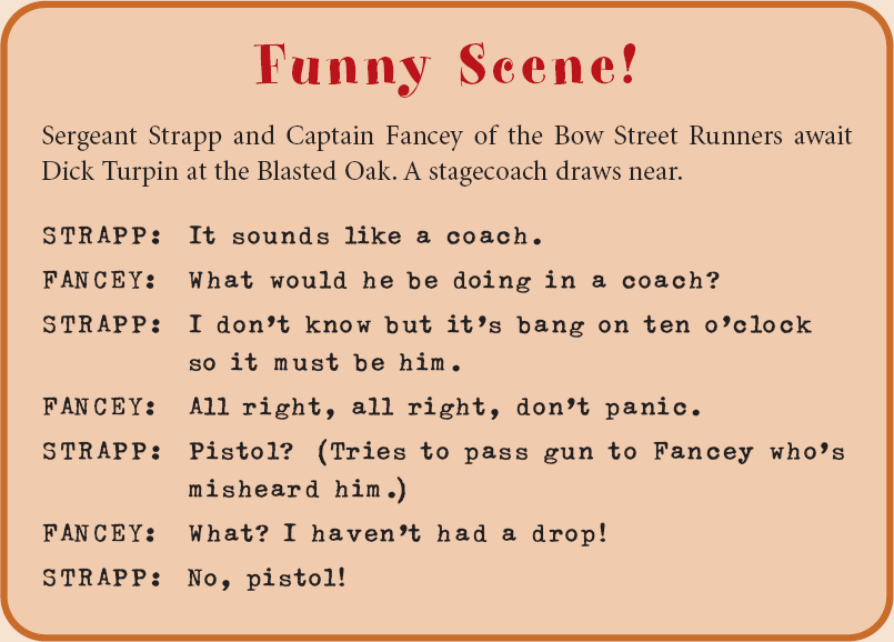 But Turpin’s game is soon up, or so everyone thinks, when one of his sidekicks, Harriett, is captured and held as bait. Fancey, Strapp and the parish constable await Turpin’s arrival, knowing that he’ll try rescuing his loyal friend and would-be lover, but yet again they’re fooled by the highwayman as he enters the local jail with his colleague, Tom, disguised as women; they end up freeing Harriett and tying up Fancey and Strapp.