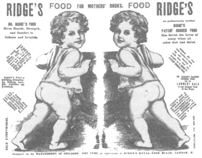 Manufactured baby food began to appear in the 1860s. By the 1870s promotions like this one, for ‘Dr Ridge’s food for mothers’ ducks’ (p. 25) were common. Note that it promises to cure babies’ indigestion, a worrying indication of what they were being ted.