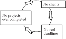 Soon I was gliding in a gold-plated lift to the Think! reception area, where a young woman sat reading a magazine in the shade of a gigantic, asymmetric blaze of tropical flowers. She looked up and smiled, gesturing for me to proceed. I found myself in a space the size of a football pitch, in which enough people to make up two teams swivelled listlessly in thousand-dollar ergonomic chairs. The place was heaving with the latest technology and the fridge was stocked with organic smoothies. I wondered vaguely who was funding all this, but then Tina came up and showed me round and I got distracted by all the activity. I was working on a website that would have been for Comedy Central TV if they’d commissioned it, but as they hadn’t we had to keep it a secret in case they sued us for using their logo. The website spoofed the X Games8 – taking place a few blocks down the road – using tiny skateboards and bicycles from cereal packets, and served to demonstrate the Think! flair. By the end of the day I had the Think! system pretty much worked out: