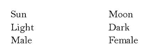 Contrasting powers are no longer understood as complementary forces arranged on a spectrum; instead they are oppositional and no spectrum exists. There are no gray areas. Boundaries between oppositional forces are clear, distinct, and absolute. (In other words, no little white dot inside the black side or black dot within the white as in the yin-yang symbol.) Each opposing force is mutually exclusive of the other.