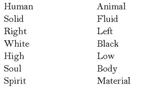 Every item on one side of the balance sheet is linked to every other item on its side and opposed to all items on the other. Each item on one side shares an essence with the others on its side; they serve the same master. The categories on this world balance sheet not only include physical observations but perceived moral, value judgments as well:
