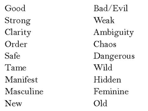 The dualist perspective stems from very human emotions: fear and anxiety, a desire for security, clarity and order, firm unwavering boundaries, a need to categorize. Look at the balance sheet: order and clarity emerge on the same balance side as good, safe, and light. Male is on that side, too, as is right, high, and white. That old shamanic swirling world of invisible, merging, ambiguous powers is chaotic, fluid, and messy. It finds itself on the balance sheet on the same side as evil, dark, dangerous, wild, and female.