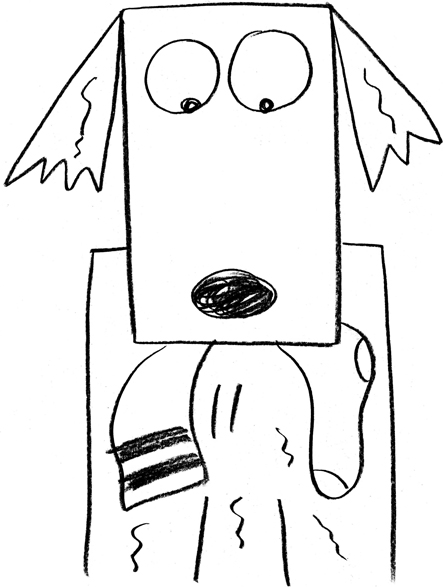 “Boy, did I! I was hoping you’d ask me next,” said Mutt. He then did a most unusual thing. He spread out his legs, took a deep breath, and shook. There was a clunking, jingling, noisy racket as things fell out of Mutt’s fur all about him. “I found a candy bar wrapper, an old pencil stub, a tennis ball that got hit and torn up by a lawn mower, a couple of good rocks, and a piece of rope, and that’s not even the best of it.”