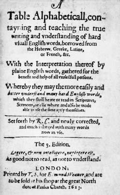 A VILLAGE SCHOOLMASTER AND PRIEST made a book in 1604 with a rambling title that began “A Table Alphabeticall, conteyning and teaching the true writing, and understanding of hard usuall English wordes,” and went on with more hints to its purpose, which was unusual and needed explanation: