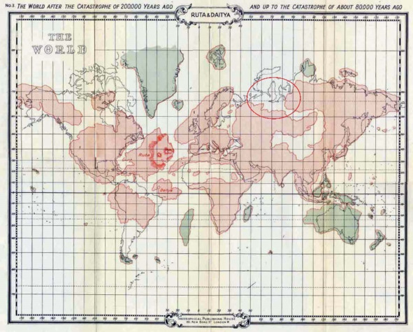 Русы поплыли на полдень. В Сказе говорится: «Впереди же скоро увидели Русы горы далекiя, а то берегъ былъ, и камень показался, и на него лоди шли». Предполагается, что «камень» означает Уральские горы, это название гор так и сохранилось до нынешнего времени. И вошли Русы в некую протоку. Представление о том, куда приплыли Русы, даёт карта Земли (Рис. 2, на карте выделена соответствующая зона), опубликованная в работе И. Донелли «Атлантида: Мир до потопа» (Atlantis: The Antediluvian World, 1882). И та земля, куда приплыли Русы, называлась «Большая Земь». «И поплыли Русы еще далее на полудень». Таким вот образом древние Русы оказались в Евразии, проживая до этого счастливо на затонувшей северной земле. Это главное, что хотелось выделить в данном Сказе.