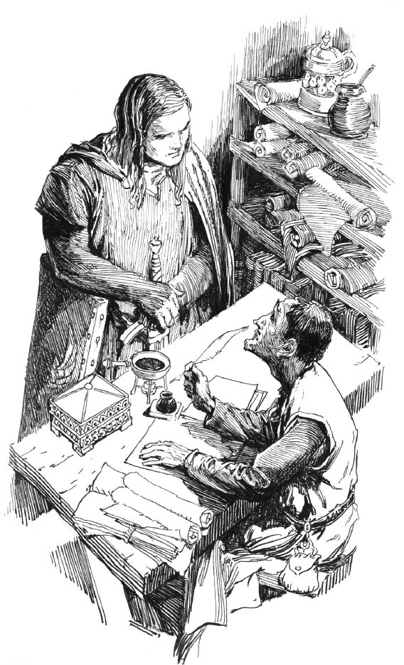 When Dunk pushed open the door, the steward was sitting at a trestle table, scratching on a piece of parchment with a quill. He had thinning grey hair and a narrow, pinched face. “Yes?” he said, looking up. “What do you want, man?”