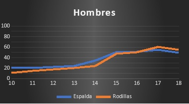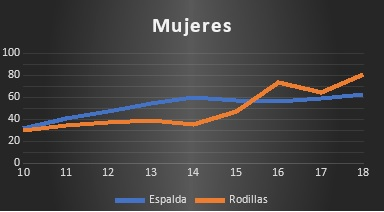 Incluyo a título informativo dos gráficos sobre la frecuencia de lesiones en espalda y rodillas en edad juvenil causadas por entrenamientos inadecuados. Edades comprendidas entre los 10 y los 18 años.