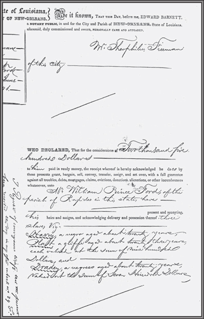 This is the bill of sale certifying that Theophilus Freeman sold Solomon Northup (called Platt) to William Ford. (Illustration Credits 1.11)