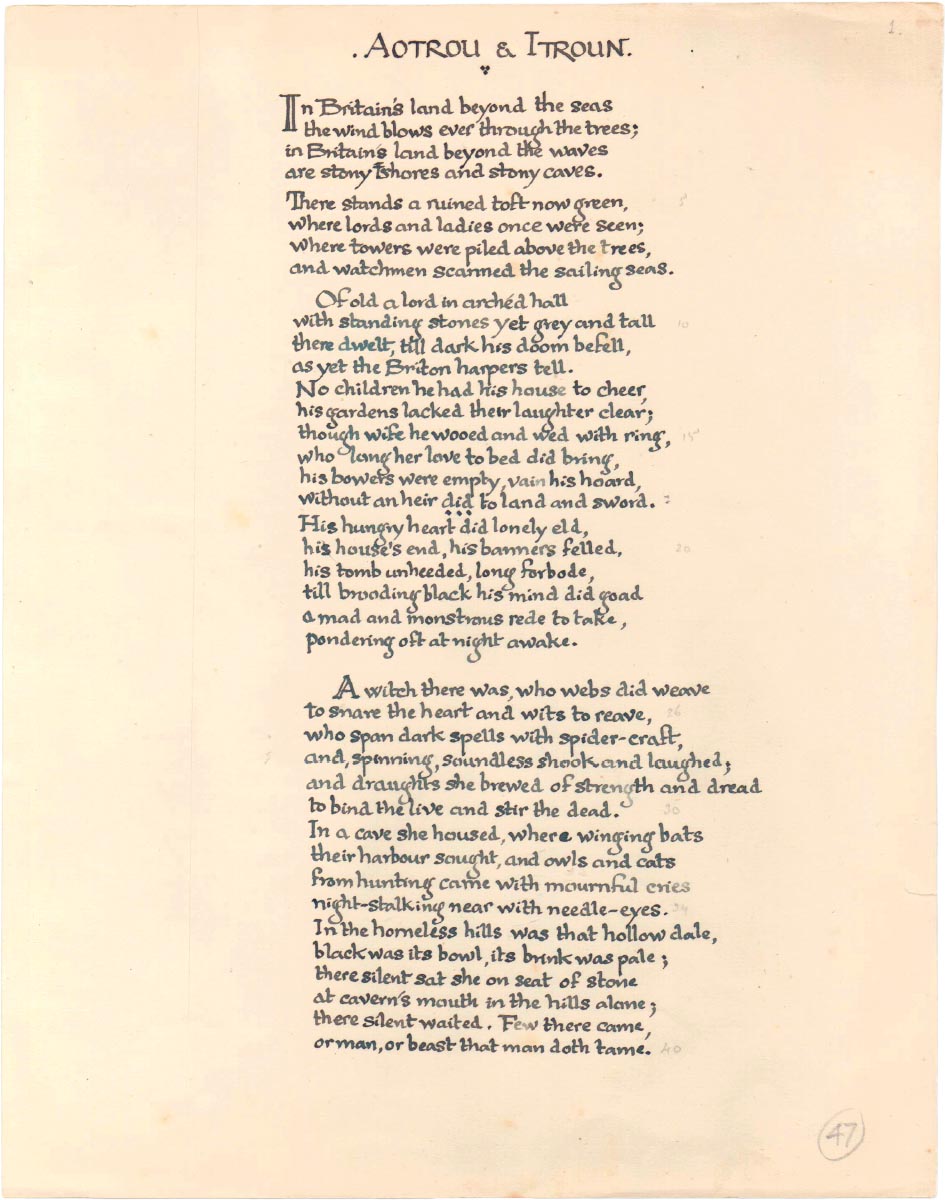 The Lay of Aotrou and Itroun was once previously printed, in The Welsh Review, Vol. IV, no. 4, December 1945. There are three texts of the poem extant (but no original workings). The first is a good but incomplete manuscript that was apparently overtaken by the second text (very little changed from the first), a fine fair copy on which my father wrote at the end a date: Sept. 23 1930. This is notable, for dates on the fair copy manuscript of The Lay of Leithian run consecutively for a week from September 25, 1930 (against line 3220), while the previous date on the manuscript is November 1929 (against line 3031, apparently referring forwards). Clearly then Aotrou and Itroun interrupted the composition of Canto X of The Lay of Leithian.
