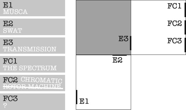 It rather looked like he had been working on some sort of multi-coded security system, because there was a diagram which was basically three squares arranged like an upside-down L, with letters and numbers marked at particular intervals, and to the side of each of the blocks: E1 E2 E3. In the middle of the third square he had written FC1 FC2 FC3. Next to these were six small pieces of coloured paper; each one was labelled with one of the sets of letters on the diagram, E1, E2, E3 etc., and on each paper was written a word or words, some crossed out, some replaced. E1, for example, said: MUSCA. E2: SWAT; E3: TRANSMISSION, F1: THE SPECTRUM. FC2 said: ROTOR MACHINE and then this was crossed out and had been replaced with CHROMATIC. FC3 was just a?