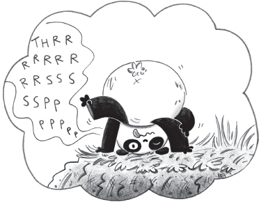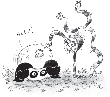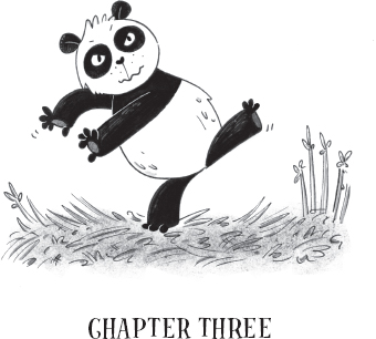 After five minutes of warming up he was in trouble. Bending at the waist, he had threaded both of his arms between his legs from behind, grabbed on to his ankles and then tried to stand up. But when he came to pull his arms back again they were knotted round his knees. He slowly toppled forward until his forehead was resting on the ground. With his black and white bottom sticking up in the air and his head curled under his tummy he looked like a rolled-up woodlouse. Now what was he going to do? Unfortunately this decision was taken out of his hands, because just then, with whoops and mocking cheers, the golden monkeys arrived to poke fun at poor Ping. They sat in the branches above him and poured scorn down at him.