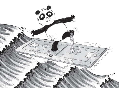 “Wooooohooooo!” Ping yelled. “I’m doing it! I’m the King of the Surf!” He couldn’t see them, but he could hear quite distinctly that the monkeys had stopped laughing. The river bent sharply to the right, allowing Ping to glance back over his shoulder, where, to his delight, he saw that the monkeys were so shocked to see him surfing that they had fallen out of their trees and were thrashing around in the water trying to get out.